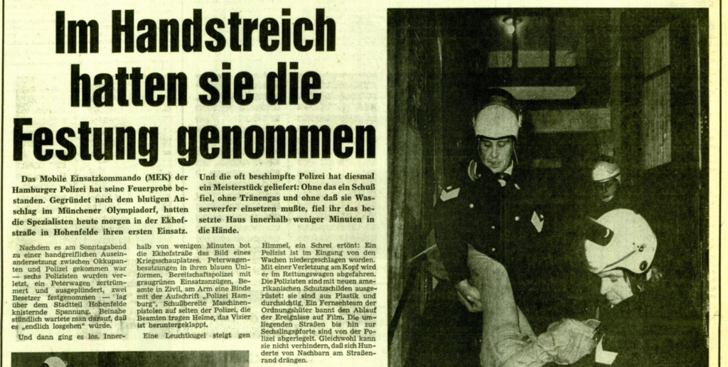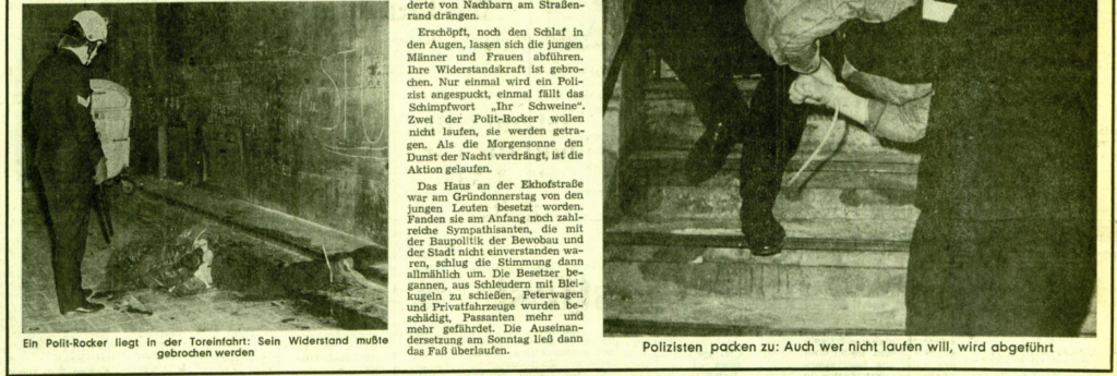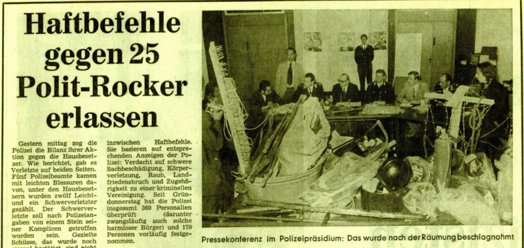 Die Besetzer gebärdeten sich militant, obwohl es dann doch bei der gewalttätigen Räumung (vgl. 23.5.1973), nur für ein Manöver der neuen Einsatzkräfte der Polizei in Form des Mobilen Einsatzkommandos (MEK) reichte. Die Zahlenverhältnisse von 70, angeblich bis an die Zähne bewaffneten Besetzern, die gerne in den Hauseingängen mit Helm und Knüppel für die geneigte Presse posiert hatten, gegen lediglich 60 normale Polizisten und nur 45 MEKler – verdeutlichen, dass es der Polizei nicht zuletzt um sportlichen Ehrgeiz ging bzw. man die Kampfkraft der BesetzerInnen für eher gering hielt und sich das MEK als neueste Truppe zur Lösung von politischen Problemen bewähren sollte. Da kam diese Hausbesetzung für einige Strategen sicher gerade recht.