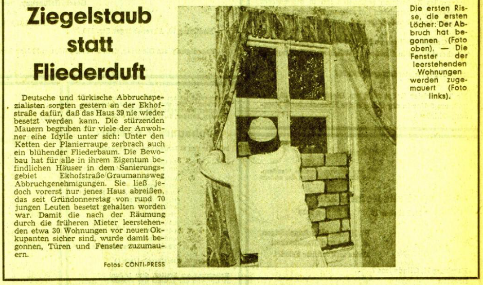 “Die Häuserkämpfe der 70er Jahre zeigen auf, daß es auch in dem Reproduktionsbereich möglich war, neue radikale Kampfformen zu entwickeln, die trotz ihres bewußten Durchbrechens von legalistischen Politikformen zu teilweise breiten Solidarisierungen innerhalb der Bevölkerung führten.”