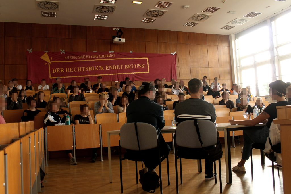 Auch Moritz aus Dresden bestätigte diesen Standpunkt. „Es sei eine Zunahme rechter Gewalt in den letzten Jahren zu beobachten aber Pogrome wie in Chemnitz oder Heidenau hat es auch in den frühen 90ern schon gegeben.“ Neu seien jedoch Bewegungen wie Pegida die einer sog. Mitte der Gesellschaft eine Sagbarkeit für ihre rechten Positionen ermöglicht. Das führe zur teilweise erfolgreichen Raumeinnahme von rechts, auch in ehemals eher linken Stadtvierteln (wie der Dresdner Nordstadt). In diesem Zusammenhang organisierte die Gruppe URA z.B. kürzlich die „Kein Viertel für Nazis“-Demonstration in Dresden.