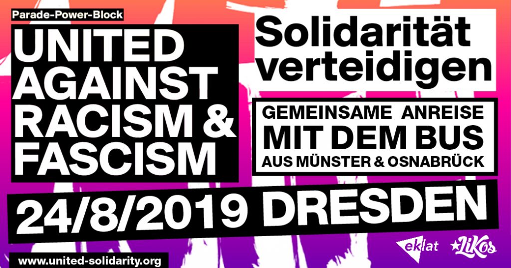 Wir rufen dazu auf sich dem antifaschistischen und antirassistischen Block der Kampagnen: Nationalismus ist keine Alternative, We’ll come united und Tribunal ‚NSU-Komplex-auflösen‘ auf der Unteilbar Demo in Dresden anzuschließen.