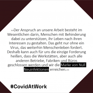 Der Anspruch an unsere Arbeit besteht im Wesentlichen darin, Menschen mit Behinderung dabei zu unterstützen, ihr Leben nach ihren Interessen zu gestalten. Das geht nur ohne ein Virus, das weiterhin Menschenleben fordert. Deshalb kann auch für uns die einzige Forderung heißen, dass die Werkstätten, aber auch alle anderen Betriebe, Fabriken und Büros geschlossen werden und wir die Marke von Null Neuinfektionen erreichen.<<