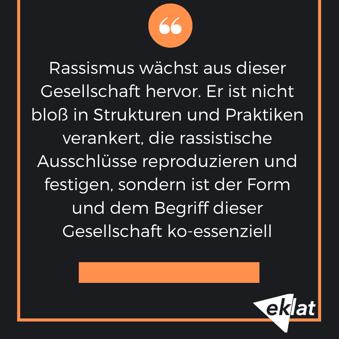 Das hat seinen Grund: dieser Rassismus wächst aus dieser Gesellschaft hervor. Er ist nicht bloß in Strukturen und Praktiken verankert, die rassistische Ausschlüsse reproduzieren und festigen, sondern ist der Form und dem Begriff dieser Gesellschaft ko-essenziell; das gilt es zu verstehen.