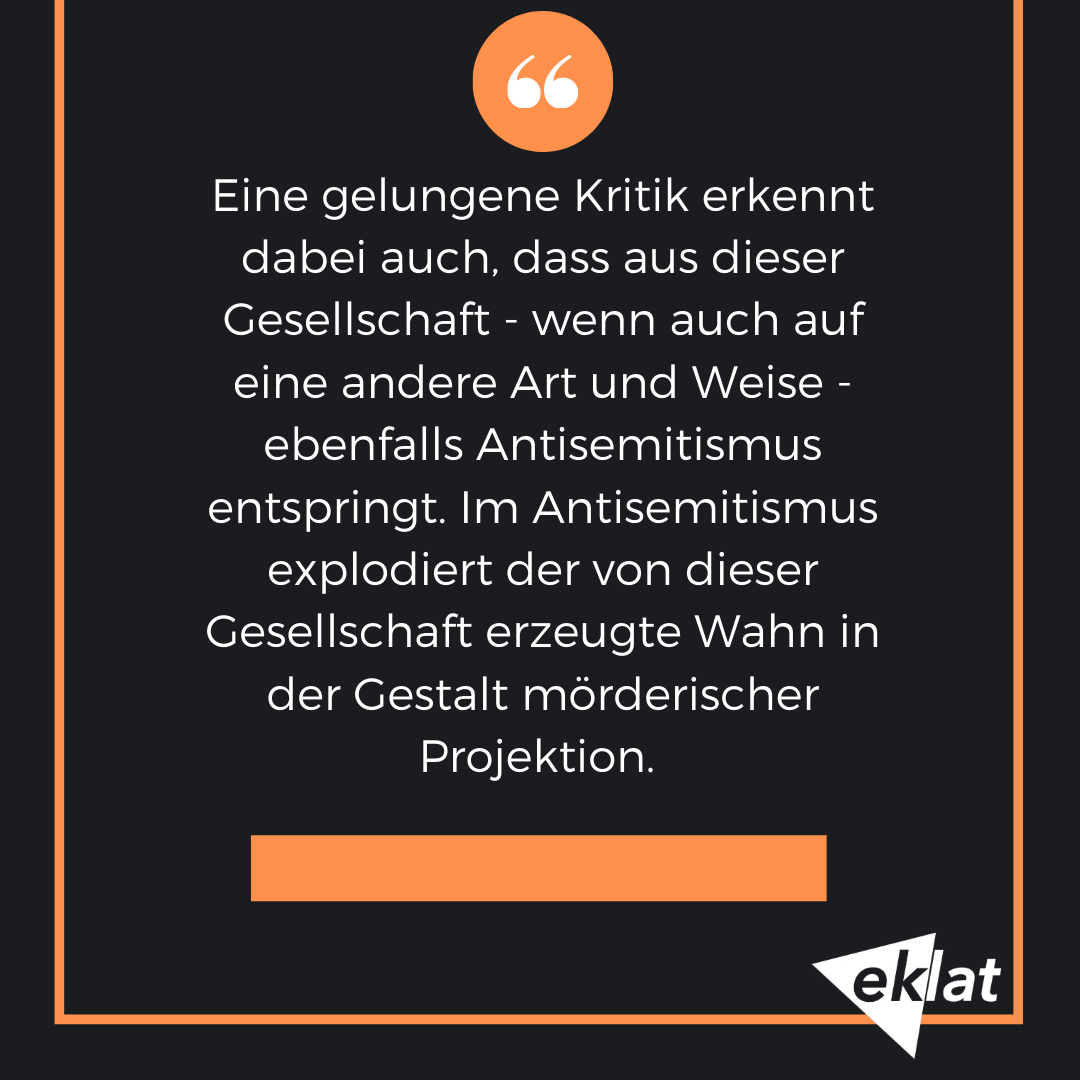 Eine solche Kritik erkennt dabei auch, dass aus dieser Gesellschaft – wenn auch auf eine andere Art und Weise – ebenfalls Antisemitismus entspringt. Im Antisemitismus explodiert der von dieser Gesellschaft erzeugte Wahn in der Gestalt mörderischer Projektion; es wird ein allgemeiner Feind imaginiert, vor dem man sich zu schützen habe, mit dem irgendwie alles Böse verbunden ist. Antisemitismus hat nicht mit dem Nationalsozialismus angefangen und nicht mit dessen Ende aufgehört. Antisemitismus ist nicht nur rechts zu finden, weil Antisemitismus gerne sowohl die Alltagswahrnehmung im bürgerlichen Normalzustand kennzeichnet als auch fehlgeleitete Oppositionsversuche.