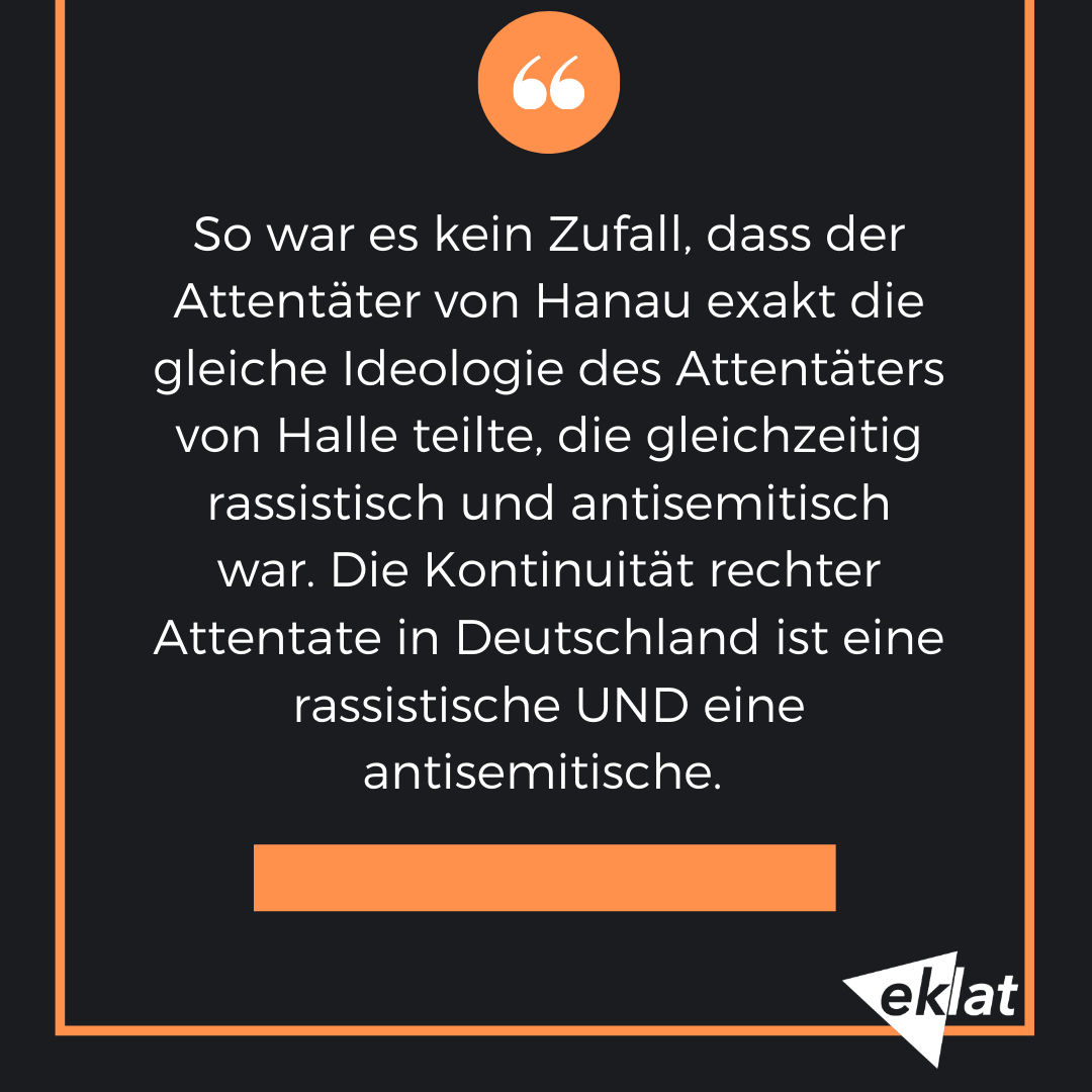 So war es kein Zufall, dass der Attentäter von Hanau exakt die gleiche Ideologie des Attentäters von Halle teilte, die gleichzeitig rassistisch und antisemitisch war. Die Kontinuität rechter Attentate in Deutschland ist eine rassistische UND eine antisemitische. Der Normalzustand dieser Gesellschaft ist rassistisch UND antisemitisch – und das auf eine besondere und eigene Spielart in Deutschland.
