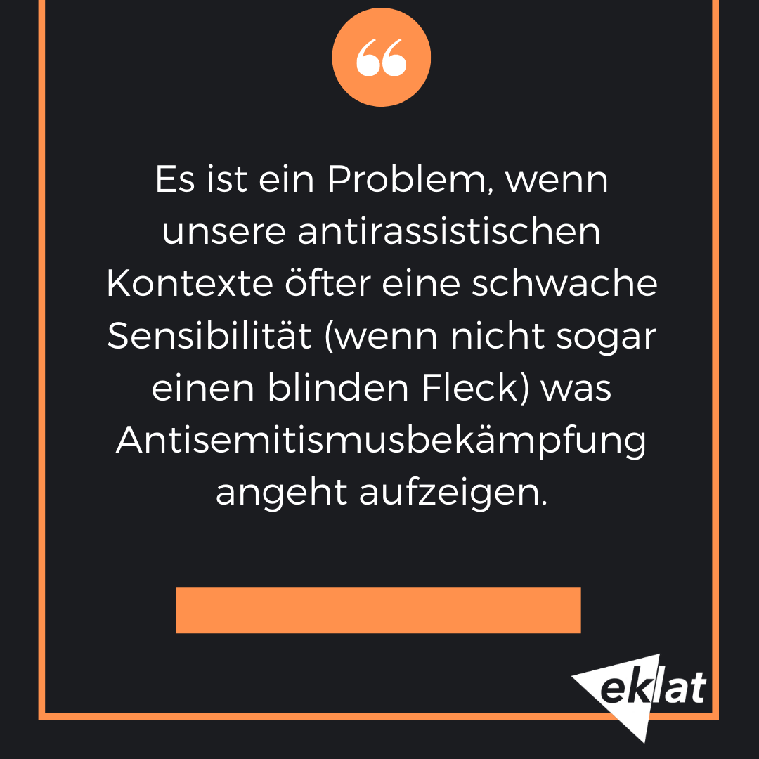 Auch deshalb ist es ein Problem, wenn unsere antirassistischen Kontexte öfter eine schwache Sensibilität (wenn nicht sogar einen blinden Fleck) was Antisemitismusbekämpfung angeht aufzeigen. Das geschieht schon dann, wenn mit aller Selbstverständlichkeit Gruppen als Teil von Bündnissen und Veranstaltungen behandelt werden, die aus dem eigenen Antisemitismus keinen Hehl machen und dabei gerne die Veranstaltungen ausdrücklich für ihre Agenda instrumentalisieren.
