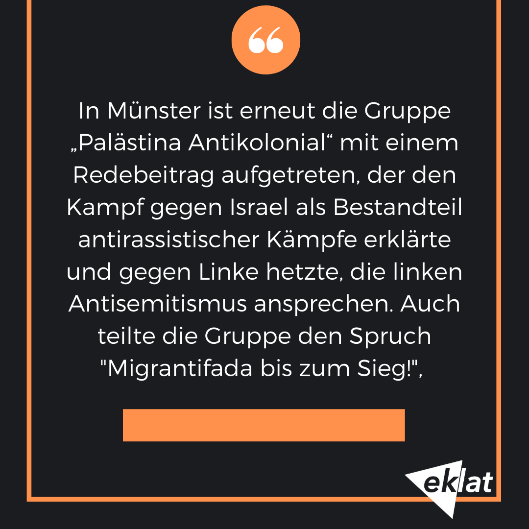 Aber auch in Münster, wo erneut die Gruppe „Palästina Antikolonial“ mit einem Redebeitrag aufgetreten ist, der den Kampf gegen Israel als Bestandteil antirassistischer Kämpfe erklärte und gegen Linke hetzte, die linken Antisemitismus ansprechen. Außerdem solidarisierte sich die Gruppe vor einigen Tagen nicht nur mit „Young Struggle“, sondern auch mit „Palästina Spricht NRW“, deren Auftreten auf der Hanau-Gedenkveranstaltung in Köln zurecht Kritik erfahren hatte (