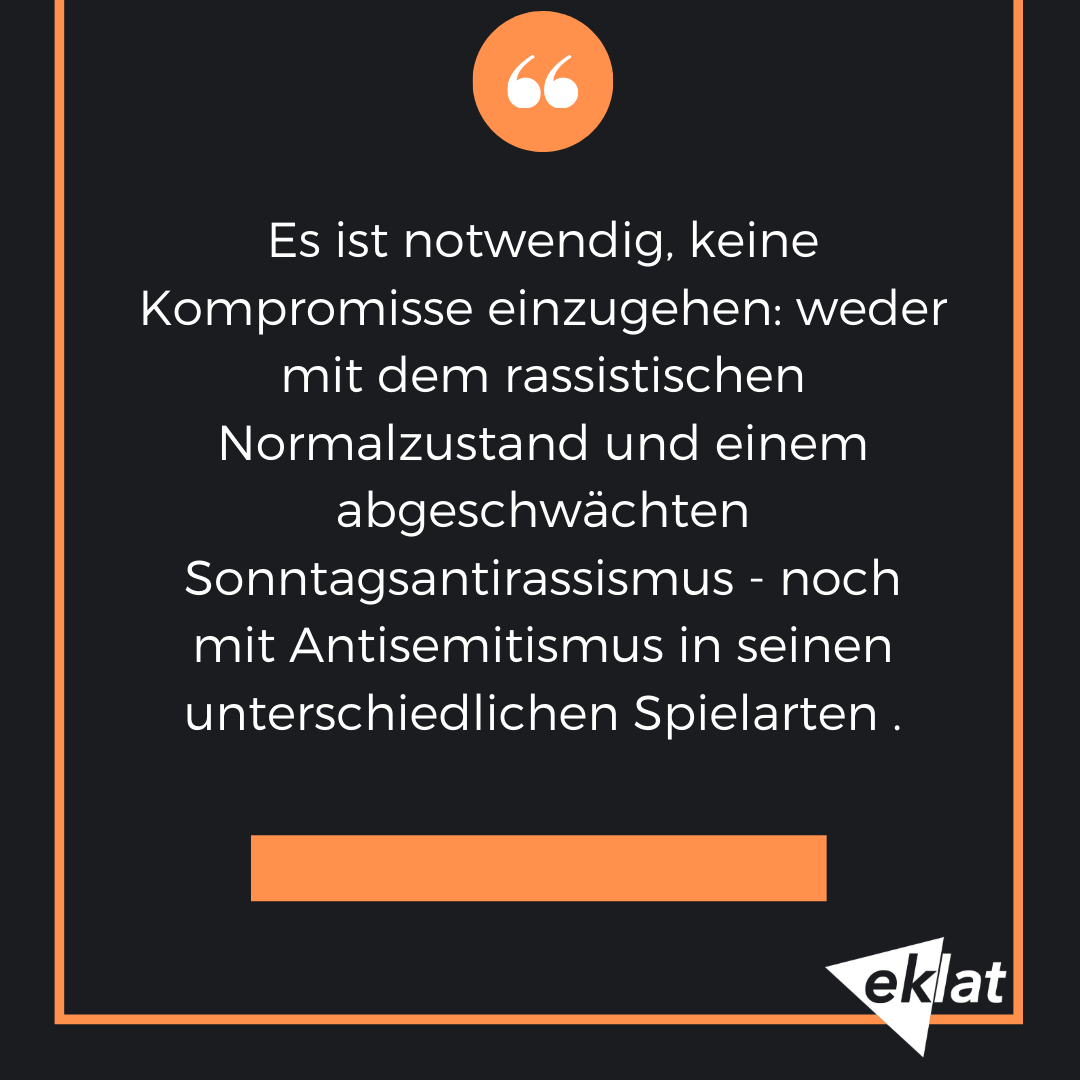 Wir möchten weiterhin auf eine Allianz aus antifaschistischen, antirassistischen und selbstorganisierten Kämpfen setzen, die fähig sei, in die Offensive zu gehen und nicht immer wieder in Abwehrkämpfe gedrängt wird. Dafür ist es aber auch notwendig, keine Kompromisse einzugehen: weder mit dem rassistischen Normalzustand und einem abgeschwächten Sonntagsantirassismus – noch mit Antisemitismus in seinen unterschiedlichen Spielarten.