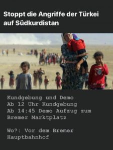 Heute, am 11.07.2020, in der Zeit von 12:00 Uhr bis 17:00 Uhr findet vor dem Bremer Hauptbahnhof eine Kundgebung mit anschließender Demo zum Marktplatz unter dem Motto ,,gegen die Angriffe der Türkei auf Südkurdistan“ statt. Der Aufzug startet ca 14:45 Uhr Richtung Innenstadt.
