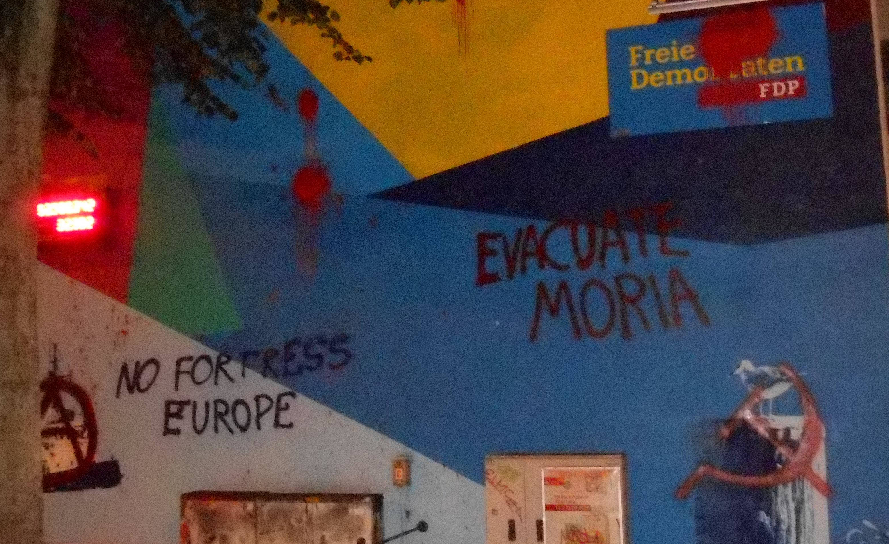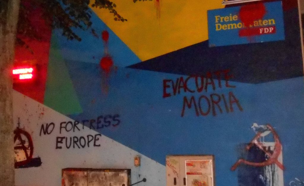 In der Bremer Innenstadt wurden in der Nacht auf Dienstag diverse Parteibüros mit „Evacuate Moria“ beschriftet und mit Farbbeuteln beworfen.