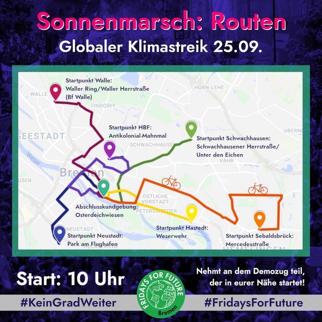 Außerdem: Jeder Strahl unseres Sonnenmarsches hat ein eigenes Thema und zeigt, wie vielfältig die Probleme aber auch die Lösungen der Klimakrise sind! Und wenn ihr alle mit auf die Straße kommt, steht Bremen an dem Tag wirklich still!