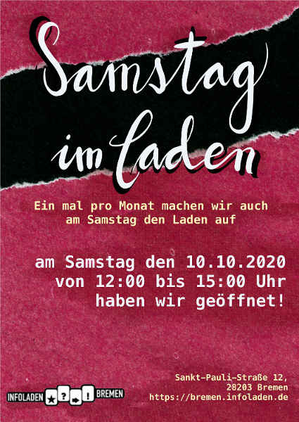 Ein mal pro Monat machen wir auch am Samstag den Laden auf. Wir sind diesen Samstag von 12Uhr bis 15Uhr für euch da.