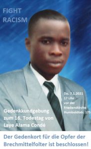 Am 16.Dezember 2020 hat die Bremer Bürgerschaft beschlossen, dass es einen Gedenkortfür Laye Condé und an 13 Jahre Brechmittelvergabe in Bremen geben soll!