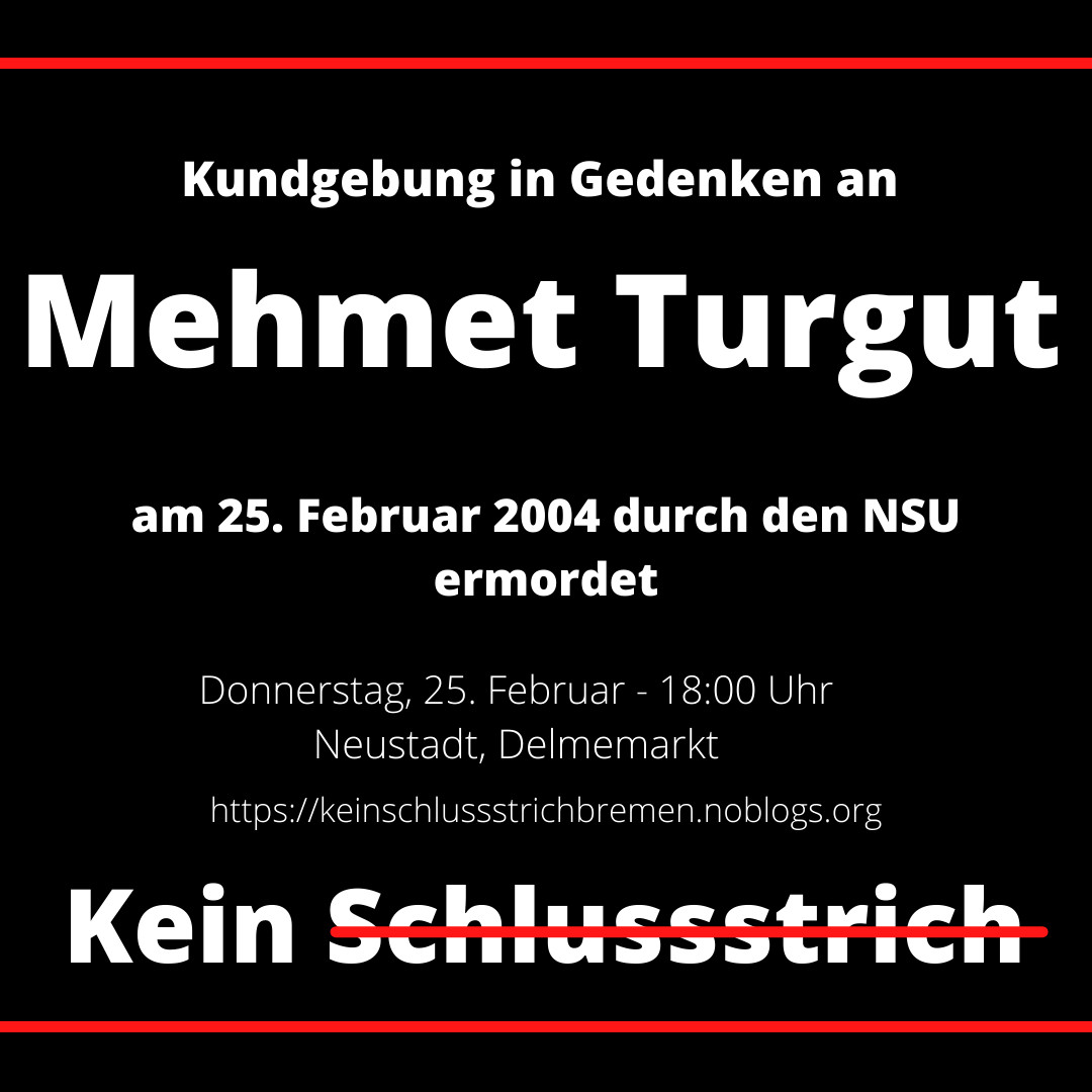 Das Kein Schlusstrich Bündnis Bremen veranstaltet am 25.02. am Delmemarkt in der Neustadt eine Kundgebung in Gedenken an Mehmet Turgut, der am 25. Februar 2004 durch den NSU ermordet wurde.