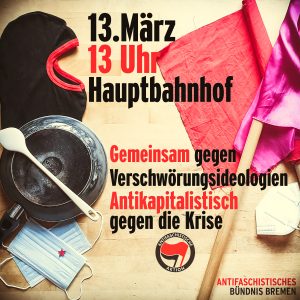 Für Samstag den 13. März rufen Corona-Rechte aus dem Spektrum des Vereins „Querdenker“ bundesweit zu Kundgebungen auf. So auch in Bremen für um 13 Uhr am Hauptbahnhof,auf der Fläche vor dem Überseemuseum.