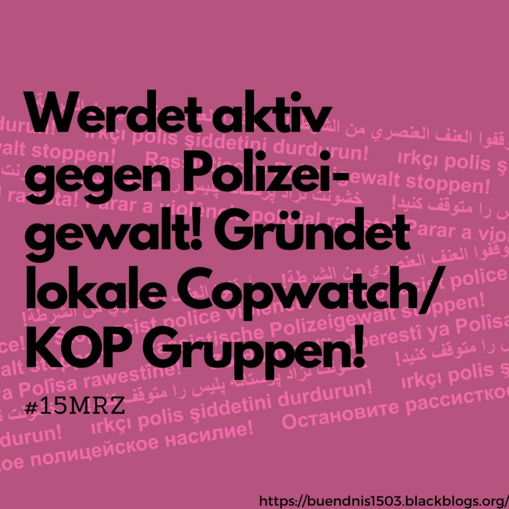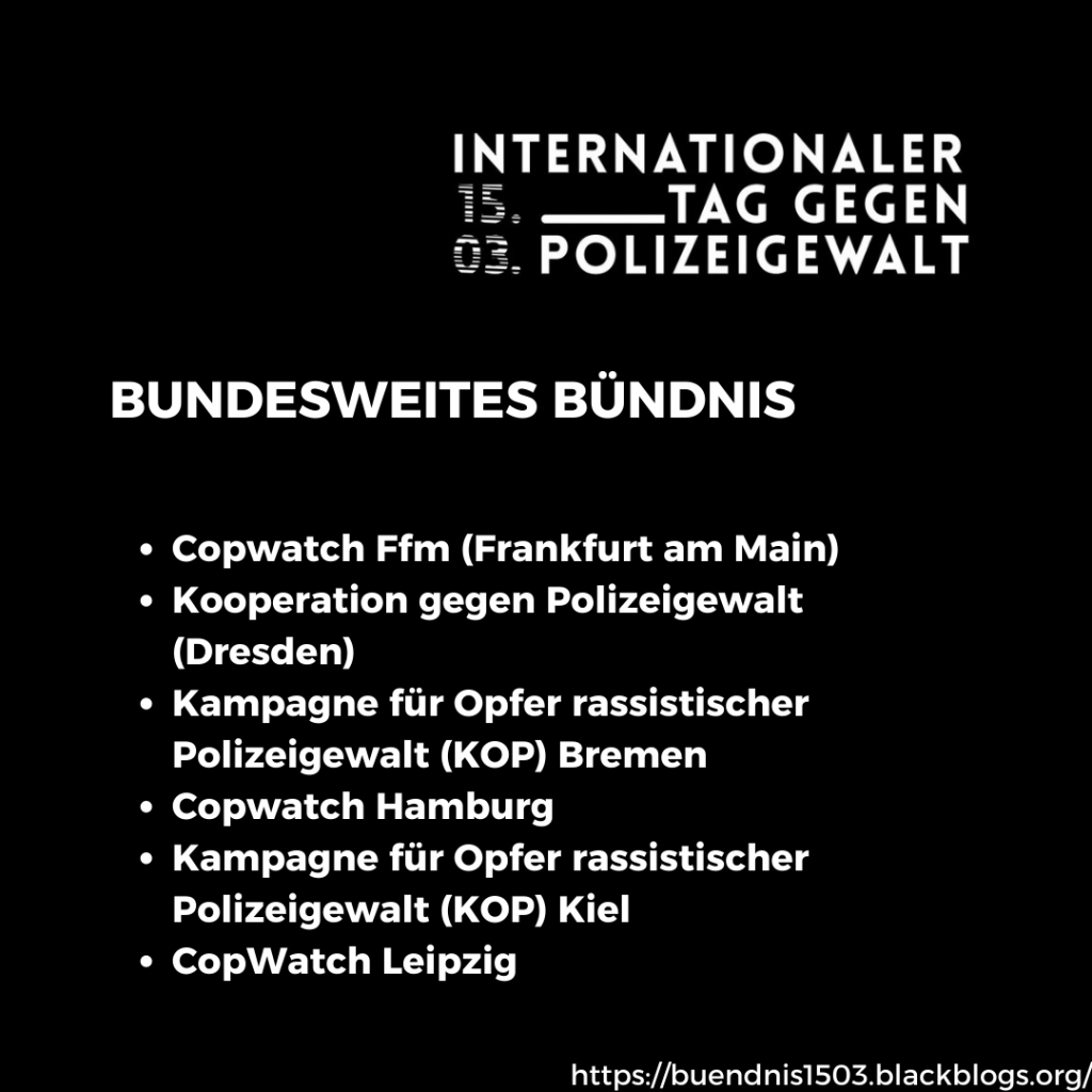 Den Internationalen Tag gegen Polizeigewalt am 15. März nehmen wir erneut zum Anlass, diese anhaltenden Missstände anzuprangern, Forderungen zu stellen und uns solidarisch mit den Betroffenen von Polizeigewalt zu zeigen. Wir sind verschiedene Initiativen, welche sich kritisch mit der Institution Polizei und Polizeigewalt auseinandersetzen. Das tun wir lokal, direkt vor unserer Haustür. Denn Polizeigewalt ist in Deutschland Alltag. In folgenden Orten gibt es Gruppen, welche Betroffene unterstützen und von ihren Erfahrungen mit Polizeigewalt in ihrer Stadt berichten.