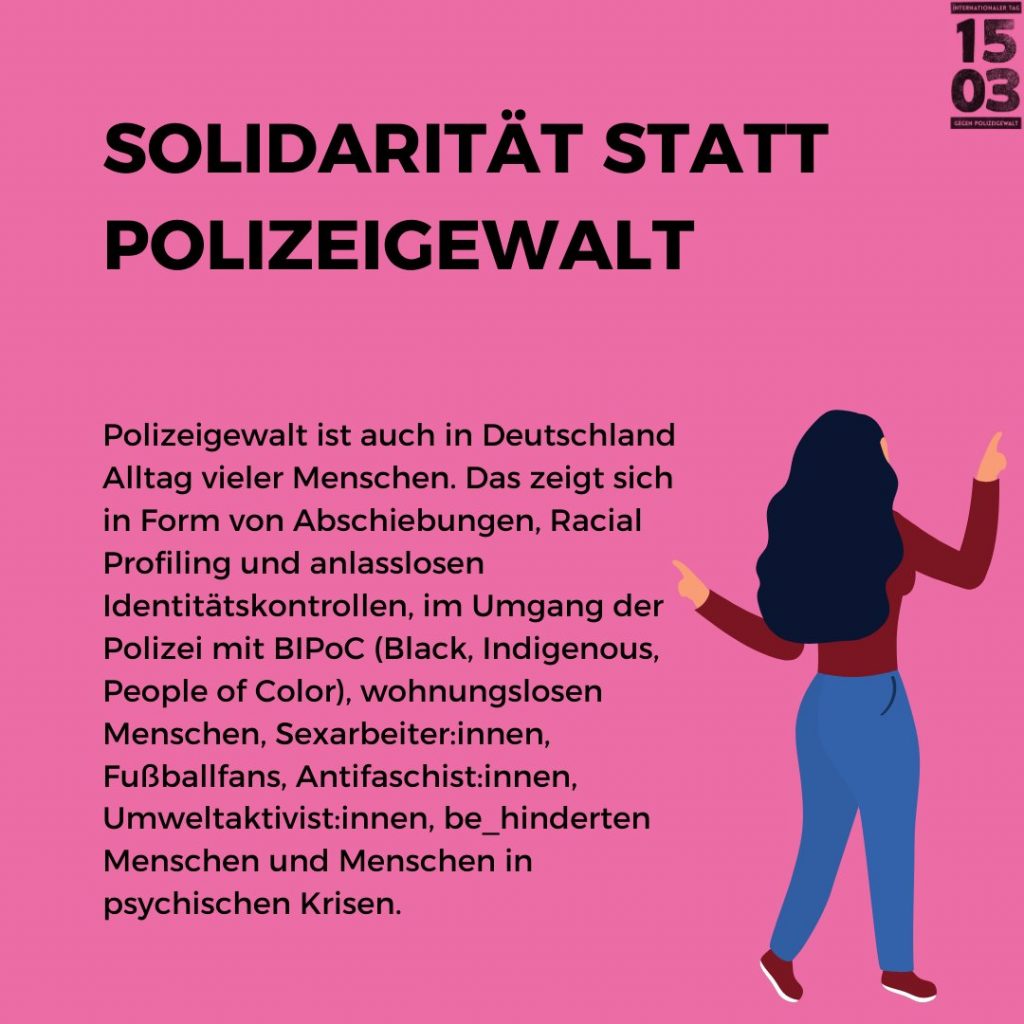 Nach dem Mord an George Floyd im Mai 2020 war rassistische Polizeigewalt kurzzeitig auch in Deutschland ein viel beachtetes Thema. Die daran anschließenden Proteste machten deutlich, dass Polizeigewalt auch hier Alltag vieler Menschen ist. Das zeigt sich in Form von Abschiebungen, Racial Profiling und anlasslosen Identitätskontrollen, im Umgang der Polizei mit BIPoC (Black, Indigenous, People of Color), wohnungslosen Menschen, Sexarbeiter:innen, Fußballfans, Antifaschist:innen, Umweltaktivist:innen, be_hinderten Menschen und Menschen in psychischen Krisen.