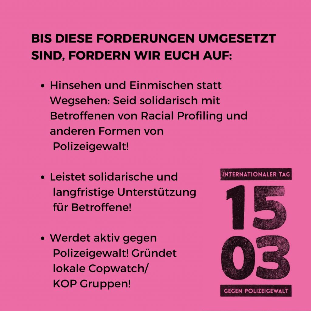 Menschenverachtende Einstellungen und gewaltvolles Verhalten bei Polizist:innen werden bagatellisiert und durch eine fortwährende Kultur der Straflosigkeit sowie einem vorherrschenden Korpsgeist gefördert oder bewusst gedeckt. Die politischen Verantwortlichen, Staatsanwaltschaften und Gerichte stellen sich schützend vor die Polizei und verhindern systematisch eine Auseinandersetzung mit dem Thema Rassismus in den Institutionen.