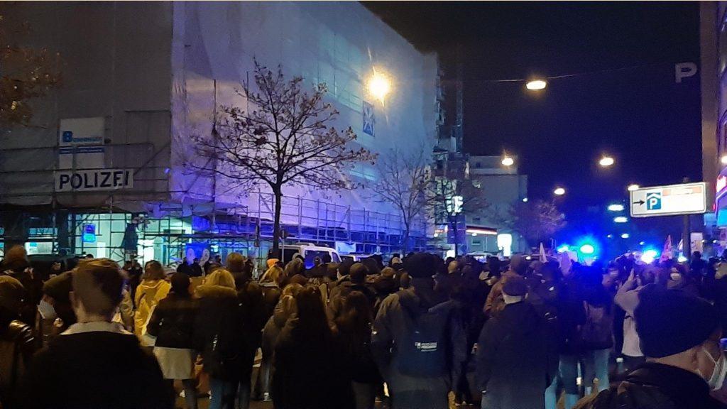 An der Wache am Hofkamp stehen sich Demonstrant*innen und Polizist*innen direkt gegenüber. In Redebeiträgen wird gesagt, aus der Wache gäbe es besonders oft brutale Einsätze. Auch #GiorgouZantioti ist im Bereich dieser Wache festgenommen worden. #w1311 pic.twitter.com/SDa3TqY38r