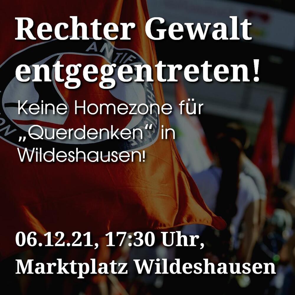 Am Montag den 06.12.2021 um 18:00 Uhr soll die nächste Veranstaltung am Marktplatz in Wildeshausen starten und durch die Stadt führen. Vergangene Woche kam es seitens der Verschwörungsgläubigen zu Gewalt gegen antifaschistische Genoss:innen. Dies werden wir niemals unwidersprochen lassen!