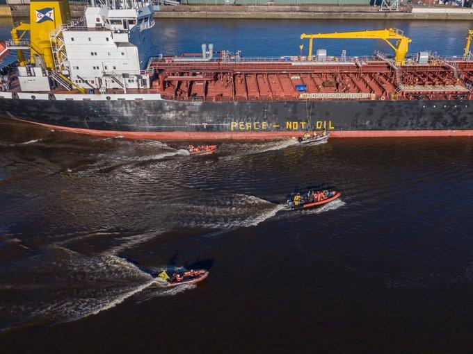 Mehrere Personen in drei Schlauchbooten versahen den 200 Meter langen und unter deutscher Flagge fahrenden Tanker dabei mit dem Schriftzug „PEACE – NOT OIL“.