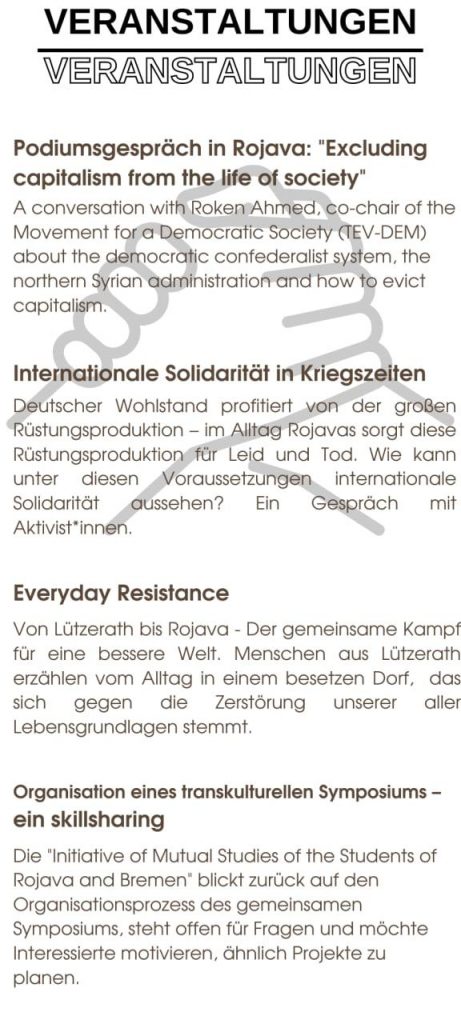 What is everyday life like in Rojava? How do they keep capitalism at a distance in their everyday social life? In which aspects does resistance show up in the everyday life of some people in Bremen and elsewhere in Germany? What role does solidarity play in this? How does mourning become an act of resistance? The project approaches these and many other questions from academic, social and activist perspectives. Contributions will come from academics John Holloway and Andrej Grubačić, the German initiative „19.Februar Hanau“, the Spokesperson of the Foreign Policy Commission in the National Congress of Kurdistan Nilüfer Koç, activists from the squattet town Lützerath (Germany) and the campaign „Rheinmetall Entwaffnen!“, the Tevgera Civaka Demokratîk (TEV-DEM) co-chair Roken