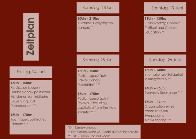 Vom 18.-26.06 organisiert die Initiative of Mutual Studies of the Students of Rojava and Bremen (IMS) gemeinsam mit der Rosa-Luxemburg-Initiative (RLI) ein Symposium zum Thema „Revolution im Alltag und Alltage in der Revolution“. Die Veranstaltungen finden in der KlimaWerkStadt, im Kukoon und per Zoom statt. Mehrere Vorträge, Podiumsdiskussionen, Filme und Workshops widmen sich aus verschiedenen Perspektiven dem Thema. Entstanden ist diese Veranstaltungsreihe in Zusammenarbeit zwischen Studierenden aus Bremen und Rojava, die sich über 9 Monate hinweg regelmäßig online getroffen, Ideen entwickelt, Erfahrungen ausgetauscht und Wissen geteilt haben. Dieser direkte Austausch soll auch beim Symposium im Fokus stehen.
