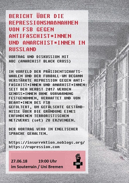 Abgesagt: „Repression gegen Antifas & Anarchist*innen in Russland“ Posted on 19. Juni 2018 by endofroad Mittwoch, 27. Juni 2018 | 19 Uhr | Souterrain