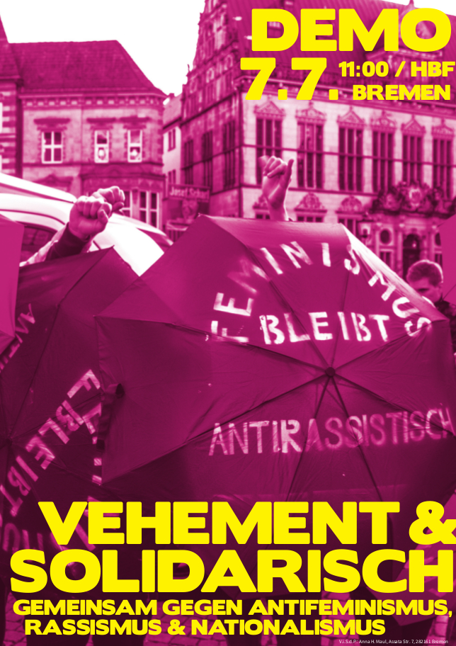 Unabhängig davon, ob Sybill de Beur einen Aufmarsch organisiert bekommt, der aus mehr als nur einer Handvoll Rechter besteht, sehen immer mehr Leute ihre Interessen durch eine rassistische und chauvinistische Politik vertreten. Die Anhänger_innenschaft rechter Parteien wächst auch in Bremen. Grund genug am 7. Juli für unseren Feminismus auf die Straße zu gehen – denn dieser ist antirassistisch und antinational!