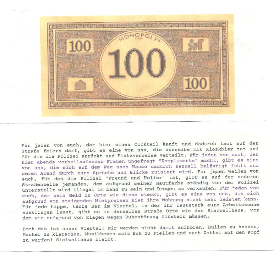 Geldregen! Posted on 9. August 2018 by endofroad Gehe nicht über Los Am Abend des 2.8. regnete es Spielgeld auf die Gäste der monatlichen Afterwork-Party im Coffee-Corner. Die Message auf der Kehrseite: Es ist alles gesagt. Solidarische Grüße!