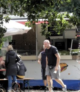 Im Gespräch mit Tanja Ostendorf ließ sich vor Ort in Erfahrung bringen, dass Hannes Ostendorf plane “den leerstehenden Verkaufsraum neben dem Imbisswagen in den kommenden Monaten umzubauen” und die “Baguetterie unter dem Namen -Baguette de France- dauerhaft” einzurichten. Der Verkaufswagen sei hingegen “nur für die Testphase”. Zum Test wie es denn so laufe. Eigentlich “nur bis zur Fertigstellung des Ladens, wenn die kommenden Umbauarbeiten in den nächsten zwei Monaten fertig” würden. Aber, man sei “noch in Verhandlungen mit den Eigentümern”. – Es ist nicht das erste Mal, dass Hannes Ostendorf eine Baguetterie betreibt. Zwischen 2006 und 2012 betrieb Ostendorf an der Lilienthaler Heerstr. 67, nahe Bremen, ebenfalls eine Baguetterie. Unter demselben Namen “Baguette de France”. Damals fasste Ostendorf den Plan, in der laufenden Baguetterie auch Nazi-Modemarken und CD’s zu vertreiben. 2012 verkaufte Ostendorf diese Baguetterie. Ob auf Betreiben des Vermieters oder allein Aufgrund von anhaltenden Protesten blieb unklar.