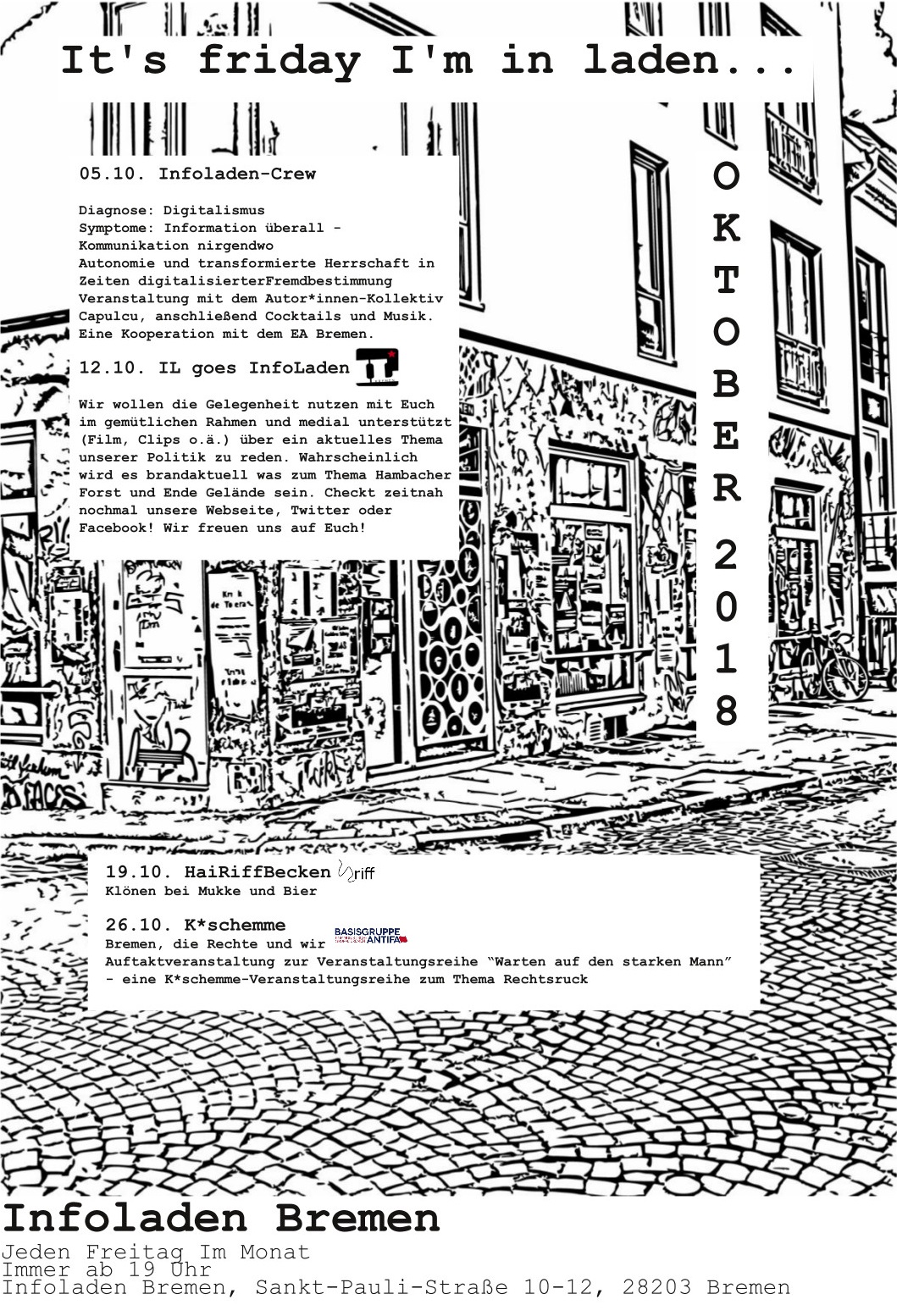 Und zusätzlich findet ab Oktober jeden Freitag unsere neue Reihe „It’s Friday I’m in Laden“ statt, welche von unterschiedlichen Gruppen getragen wird. Jeweils ab 19:00 Uhr wird der Abend unterschiedlich gestaltet. Ob Kneipenabende mit bestimmten Themen oder Vorträge oder beides in einem: es lohnt sich auf jeden Fall am Freitag Abend einfach mal im Infoladen reinzuschauen!