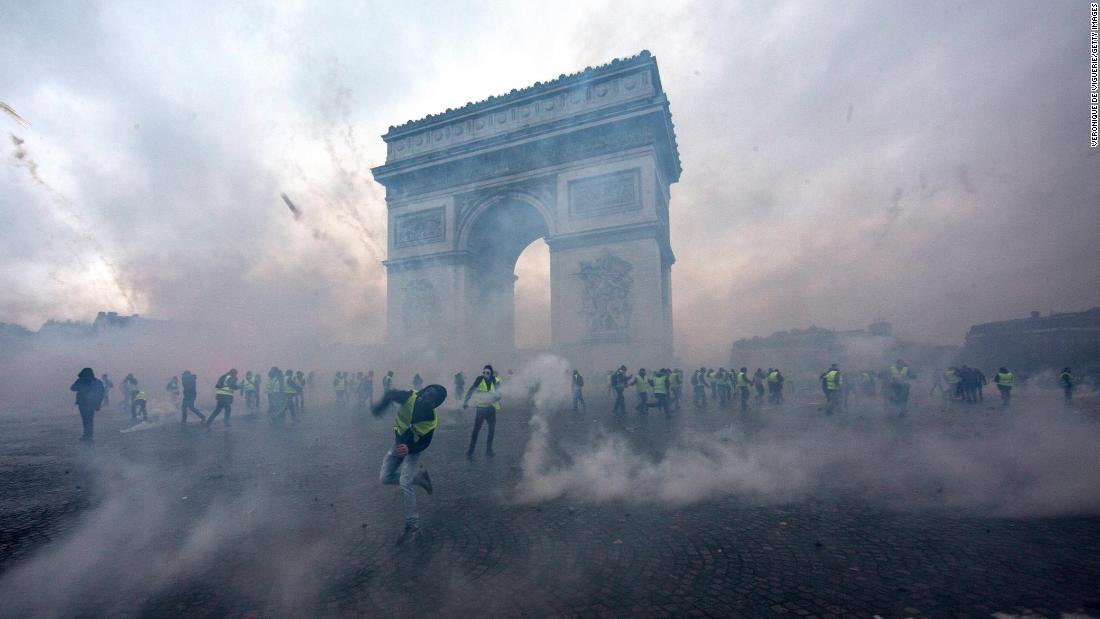 PARIS, FRANCE – DECEMBER 01: Teargas surrounds protesters as they clash with riot police during a ‚Yellow Vest‘ demonstration near the Arc de Triomphe on December 1, 2018 in Paris, France. The third ‚Yellow Vest‘ (gilets jaunes) rally in Paris over increased fuel taxes and leadership in the government today caused over 150 arrests in the city with reports of injuries to protesters and security forces from violence that irrupted from the clashes. (Photo by Veronique de Viguerie/Getty Images)