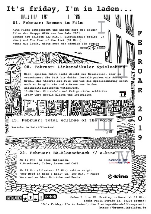 getragen wird. Jeweils ab 19:00 Uhr wird der Abend unterschiedlich gestaltet. Ob Klönabende mit bestimmten Themen oder Vorträge oder beides in einem: es lohnt sich auf jeden Fall am Freitag Abend einfach mal im Infoladen reinzuschauen!