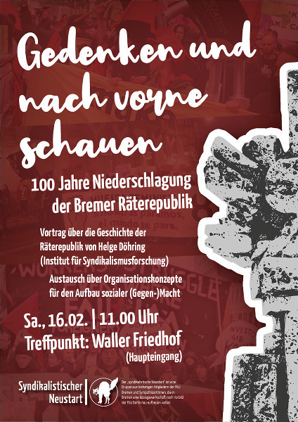 Am 04. Februar 1919 wurde die Bremer Räterepublik im Stadtgebiet Bremen niedergeschlagen. Ein paar Tage später fiel die Räterepublik auch in Bremerhaven den rechten Freikorps zum Opfer. In Zeiten des Aufbruchs zum Ende des 1. Weltkriegs und dem erstreikten endgültigen Niedergang des Kaiserreichs sollte die Räterepublik den Elan der Novemberrevolution weitertragen. Letztlich scheiterte sie an inneren politischen Verwerfungen, wirtschaftlichen Zwängen und militärischem Druck. 29 Zivilisten und 28 revolutionäre ArbeiterInnen verloren ihr Leben, darunter die Syndikalisten Karl Mesike und Willy Glock.