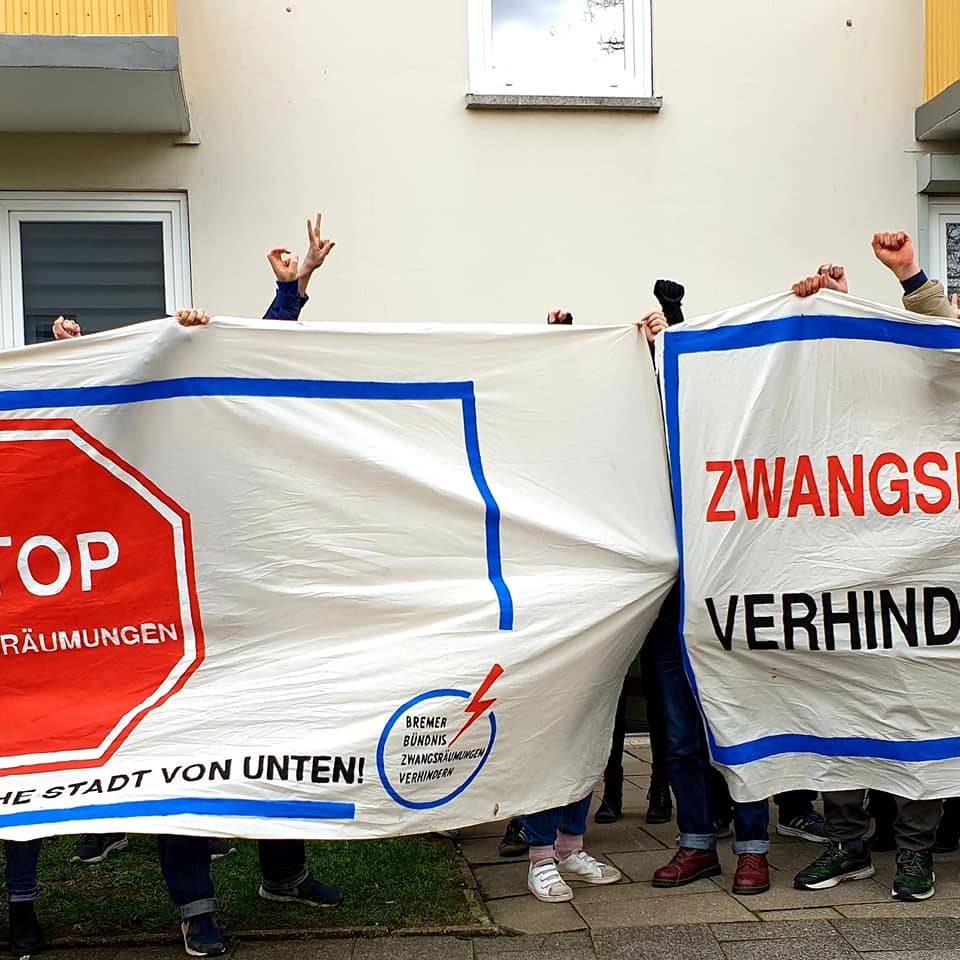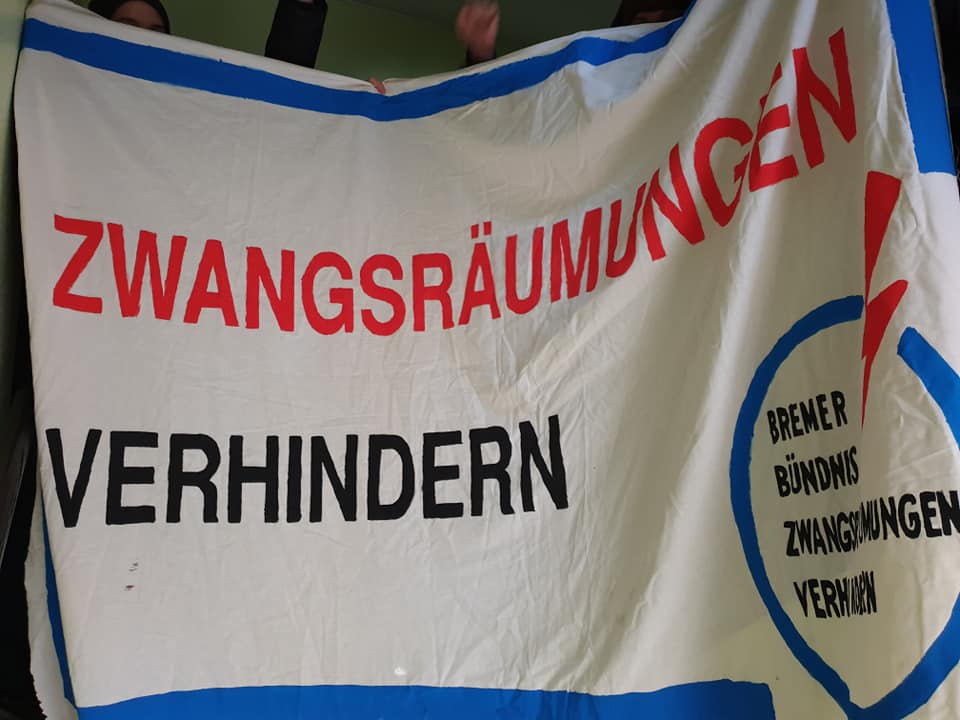 Zwangsräumung? Verhindert! In Bremen-Vegesack sollte heute im Auftrag der, seit kurzem städtischen, Wohnungsbaugesellschaft BREBAU eine Zwangsräumung vollstreckt werden. Wieder einmal sollte jemand seine Wohnung verlieren, wohungslos werden und wortwörtlich auf der Straße stehen. Bereits früh am Morgen waren wir mit vielen Aktivist*innen vor Ort. Als die Gerichtsvollzieher*in mit den Möbelpackern dann auch anrückte, hingen unsere Transparente bereits aus dem Haus, waren die Flyer an die Nachbar*innen längst verteilt und lief unser Redebeitrag, mit dem wir unsere Aktion erklärten, in Dauerschleife. Die überraschte Gerichtsvollzieher*in rief daraufhin die Bullen. Die, nicht minder überrascht, konnten es nicht recht fassen: So seien nun mal Recht und Gesetz. Wohnungslosigkeit und Zwangsräumungen sind für uns aber nicht verhandelbar! Wütend aber unverrichteter Dinge mussten schlussendlich Bullerei und Gerichtsvollzieher*in wieder abziehen.