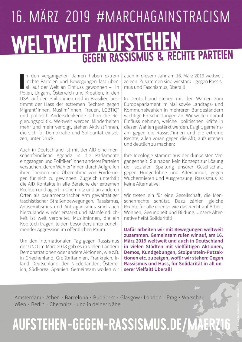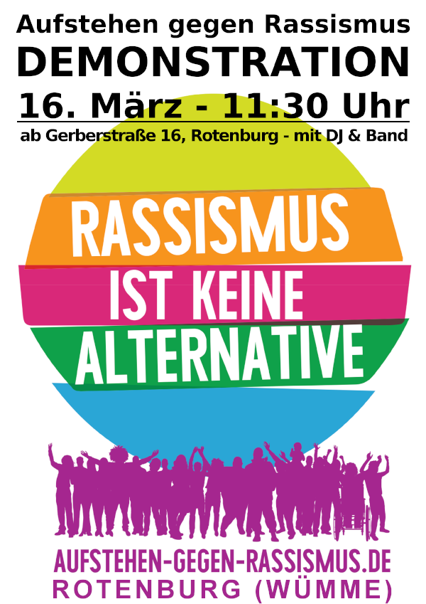 ROW: Aufstehen gegen Rassismus Posted on 7. März 2019 by endofroad Samstag, 16. März 2019 | 11:30 Uhr | Parkplatz Gerberstraße (Rotenburg Wümme) Elektronische Beats aus der Röhre | Band + DJ nach der Kundgebung