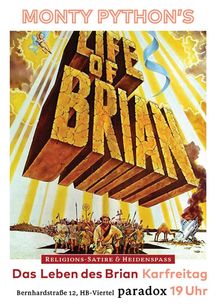 „Das Leben des Brian“ ist Karfreitag übrigens verboten… Posted on 10. April 2019 by endofroad Freitag, 19. April 2019 | 19 Uhr | Paradox