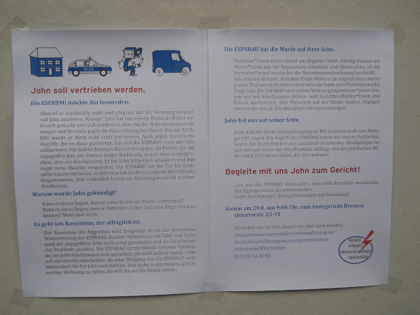 Obwohl er regelmäßig zahlt und pflegsam mit der Wohnung umgeht, soll John ausziehen. Warum? John hat von seinem Recht als Mieter Gebrauch gemacht und sich wiederholt über falsche Nebenkostenabrechnungen und Verstöße gegen die Hausordnung beschwert. Von der ESPABAU wurde er darin nicht ernst genommen. Auch gegen rassistische Angriffe, die im Haus passierten, hat sich die ESPABAU nicht mit John solidarisiert. Ein fadenscheiniges Hausverbot gegen die Person, die ihn angegriffen hat, den Partner seiner Nachbarin, wurde zwar ausgesprochen, aber nie durchgesetzt. Er hat John körperlich attackiert und ihm sogar seine Haustür eingetreten. Die ESPABAU hat die Tür bis heute nicht reparieren lassen. Stattdessen hat sie diese Zustände über Monate hingenommen. Und schließlich landet ein Räumungsbescheid in Johns Briefkasten.