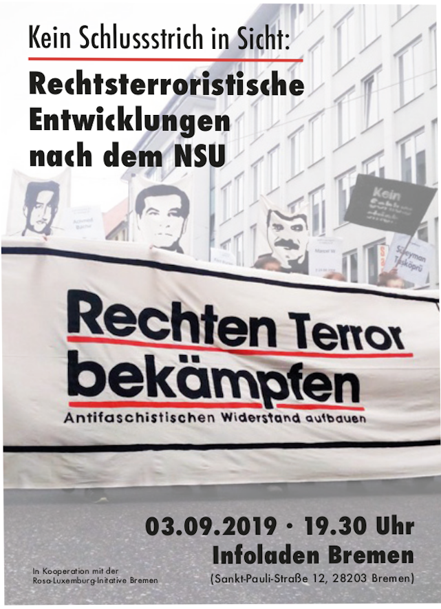 Wie können wir als Antifaschist*innen uns dem entgegen stellen? Haben wir es mit einer neuen Qualität rechten Terrors zu tun, wie manche behaupten? Welche neuen rechtsterroristischen Entwicklungen lassen sich nach der Selbstenttarnung des NSU feststellen? Was für eine Bedeutung hat der NSU-Komplex für aktuelle rechtsterroristische Strukturen?