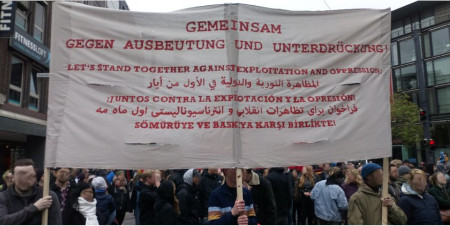 Die dritte Voraussetzung umfasst den internationalistischen Charakter der Demonstration. Internationalismus bedeutet für uns nicht nur die Solidarität mit kämpfenden Bewegungen weltweit. Aufgrund des zunehmend global organisierten Kapitalismus und der Folgen des Imperialismus weltweit ist Internationalismus für uns nur als Aufforderung zu verstehen, Strategien zu entwickeln, um innerhalb dieser Gesellschaft internationalistische Kämpfe anzustoßen oder zu stärken. Damit soziale und politische Kämpfe innerhalb der Bundesrepublik einen solchen internationalistischen Charakter entwickeln, spielt die breite Beteiligung von Menschen eine zentrale Rolle, die in die BRD migriert sind oder hier inzwischen in der dritten oder vierten Generation leben, aber aufgrund von Bezügen zu den jeweiligen Herkunftsländern häufig direkte oder indirekte Erfahrungen mit den Auswirkungen imperialistischer Politik haben. Um diese unterschiedlichen Communities zu erreichen und zusammenzubringen, ist es notwendig, dass revolutionäre Linke aus unterschiedlichen Ländern, die innerhalb der BRD leben, eine gemeinsame Strategie der Gesellschaftsveränderung für die hiesige Gesellschaft entwickeln, anstatt sich nur vereinzelt miteinander zu solidarisieren oder für einzelne Aktionen gemeinsam zu mobilisieren. Im Hinblick auf revolutionäre migrantische Linke (und in Teilen auch Exilorganisationen) bedeutet dies, nicht nur den revolutionären Kämpfen und Entwicklungen in den eigenen Herkunftsländern zu folgen und in der BRD sozialdemokratische oder linksliberale Politik zu betreiben, sondern auch für die hiesige Gesellschaft eine revolutionäre Perspektive zu entwickeln. [3]