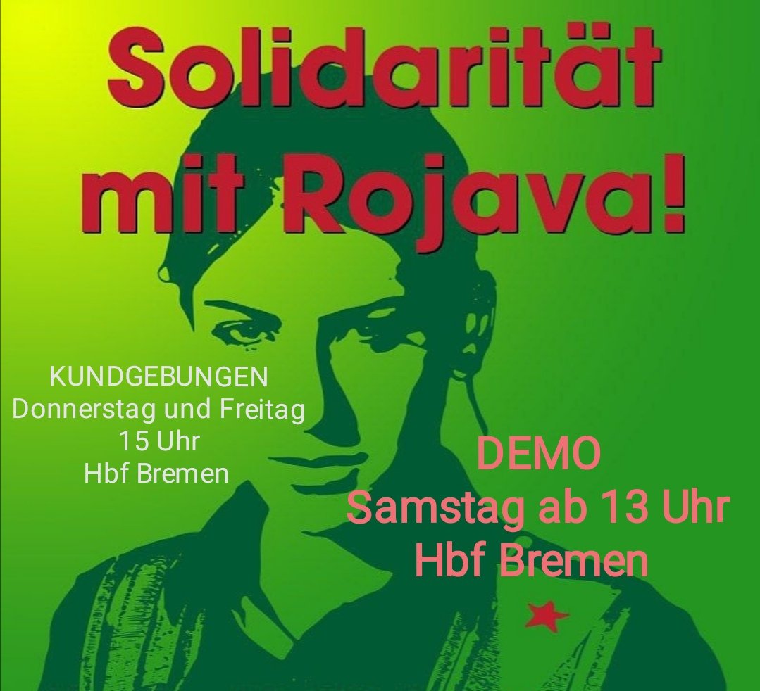 Wir rufen euch deshalb alle auf, in den kommenden Tagen weiter mit uns auf die Straße zu gehen. Jede Kundgebung, jede Demo, jede Aktion ist jetzt ein wichtiges Zeichen der Solidarität für die Bevölkerung von Rojava und ein notwendiger Protest gegen das menschenverachtende Spiel der herrschenden Politik.