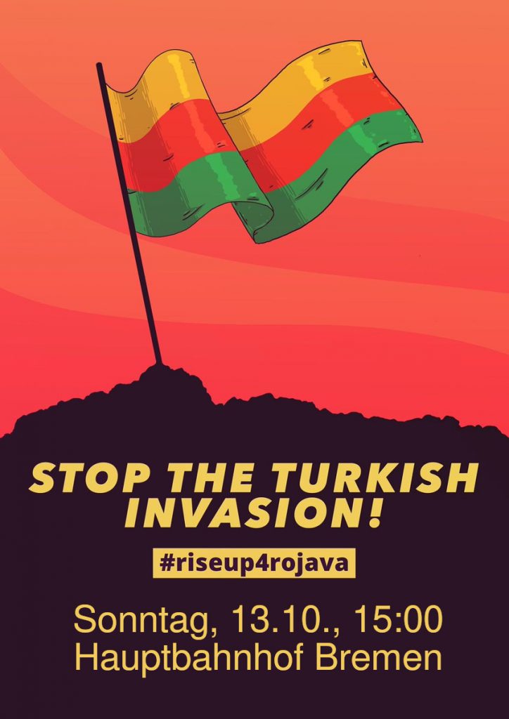 Nachdem gestern mehrere Tausend Personen in Bremen (bzw. bundes- und weltweit) gegen den Angriffskrieg der Türkei auf Rojava auf der Straße waren, geht der Protest weiter: