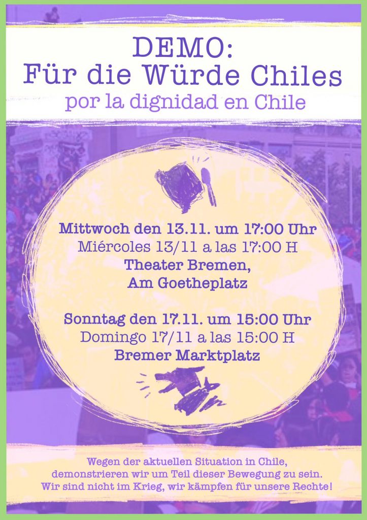 Ich verstehe deinen etwas kryptischen Kommentar als eine Anspielung auf die Geschichte der Colonia Dignidad. Dieser Bezug war uns bei Veröffentlichung nicht bewusst. Möglicherweise ist er auch den Organisator_innen der Kundgebung nicht bewusst. Könntest Du für uns einen kurzen Text zu der Sache schreiben?