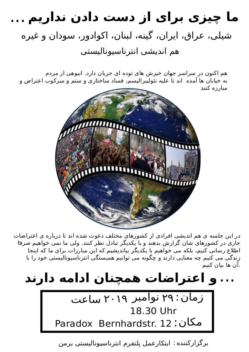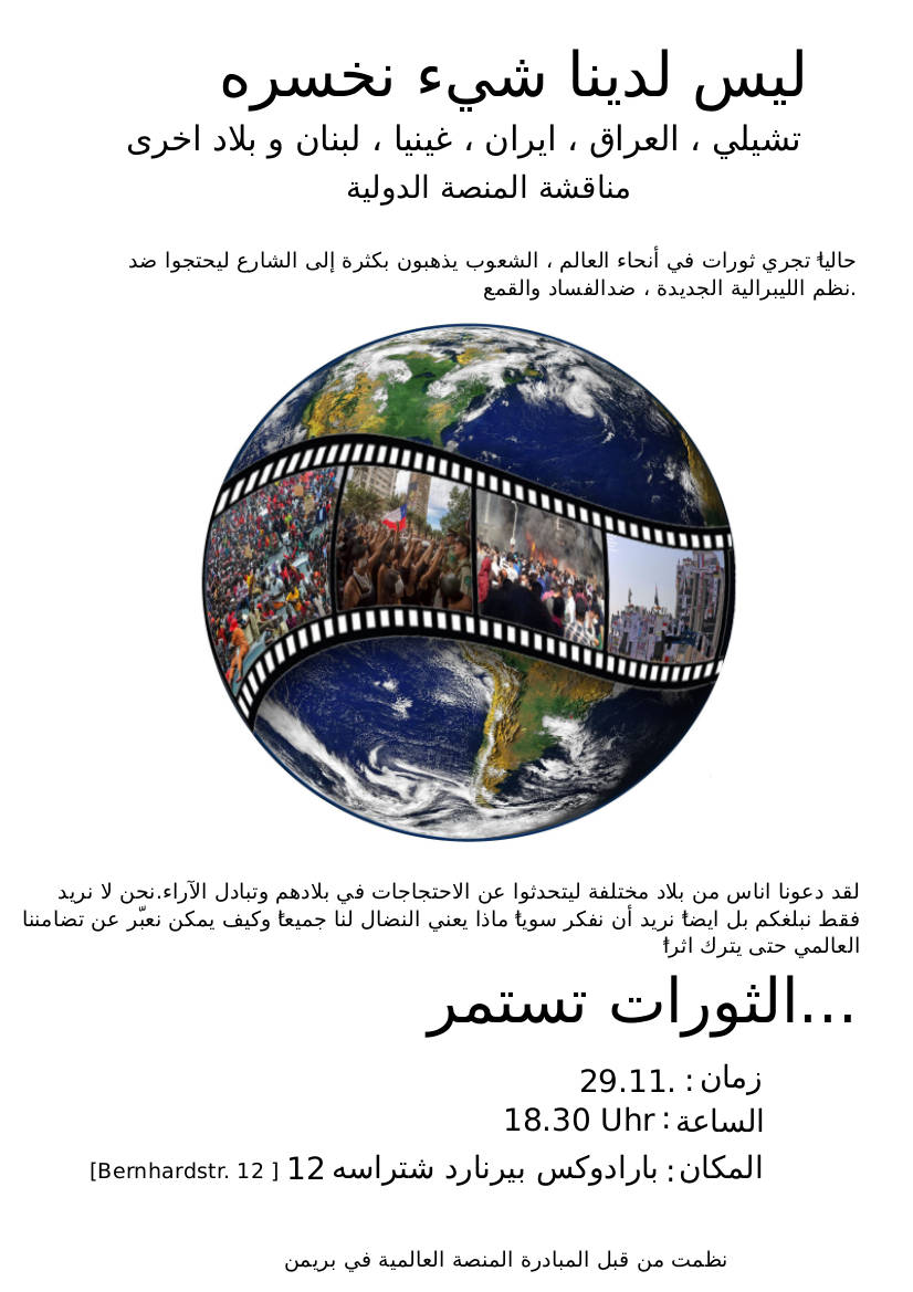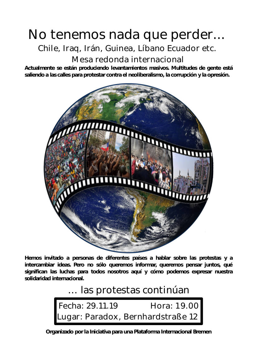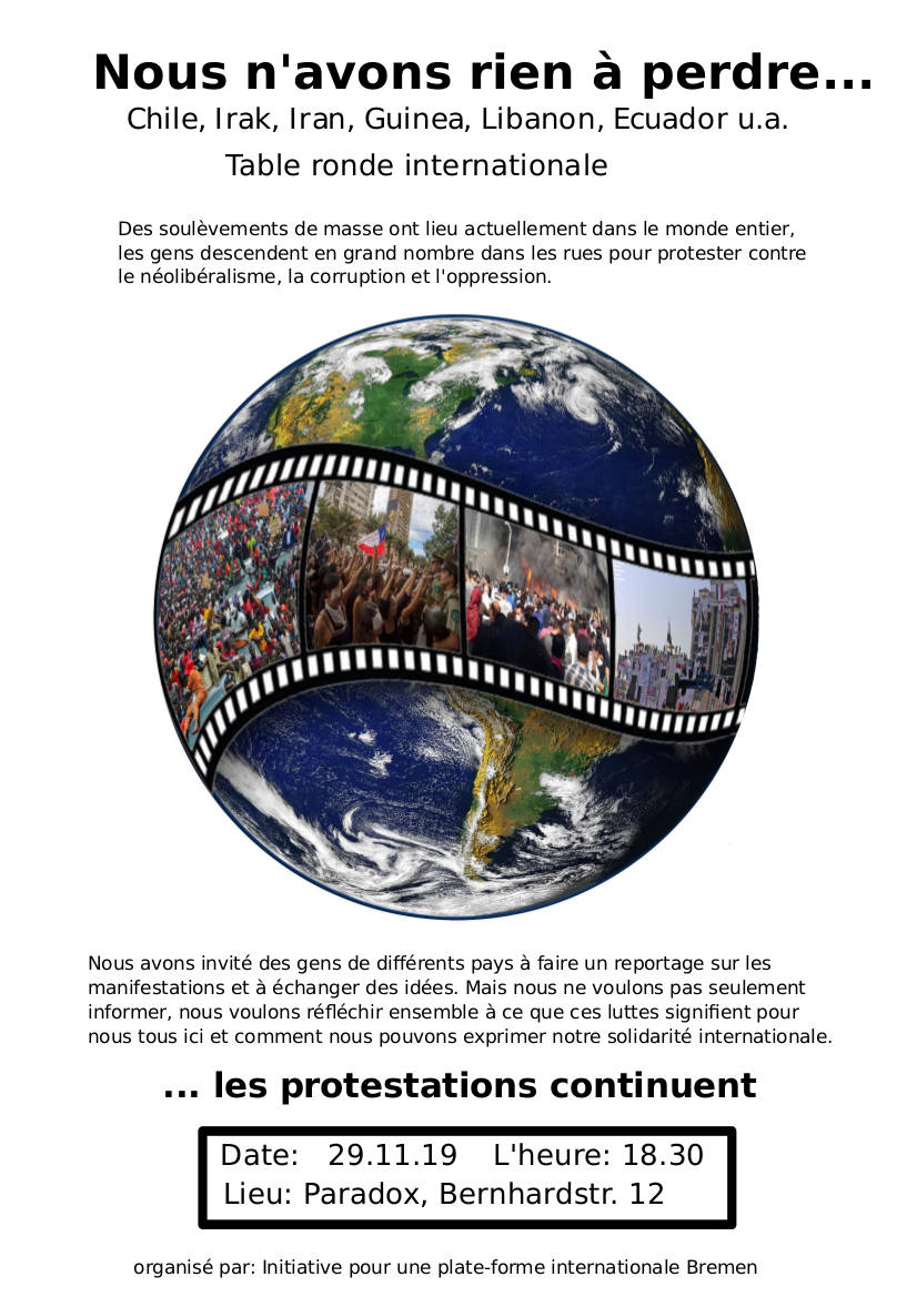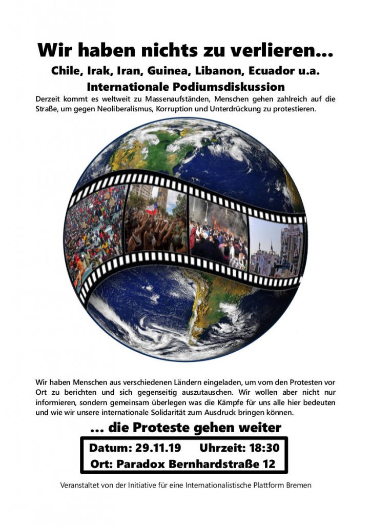 Wir haben Menschen aus Irak, Iran, Guinea, Libanon und Chile eingeladen, um über die Proteste vor Ort zu berichten und uns gegenseitig auszutauschen. Wir wollen uns aber nicht nur informieren, sondern gemeinsam überlegen, was die Kämpfe für uns alle hier bedeuten und wie wir unsere internationale Solidarität zum Ausdruck bringen können.