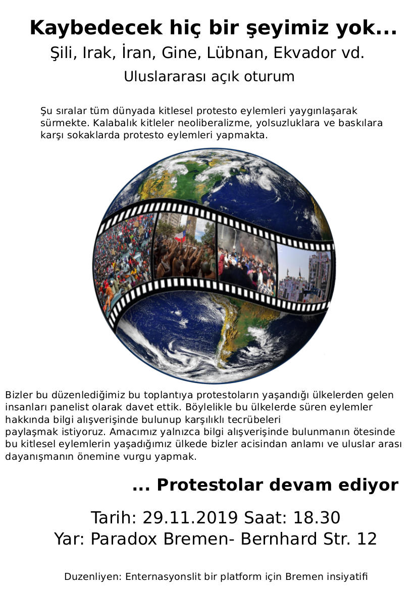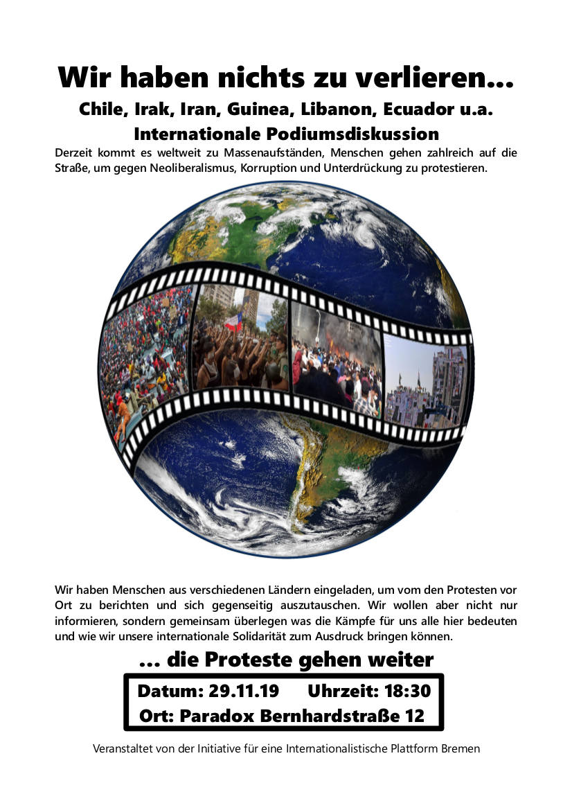 Wir freuen uns, wenn ihr die Veranstaltung insbesondere an Freund*innen, Bekannte und Genoss*innen weiterleitet, die selbst Bezüge zu den genannten Protesten haben und hier in Bremen leben.