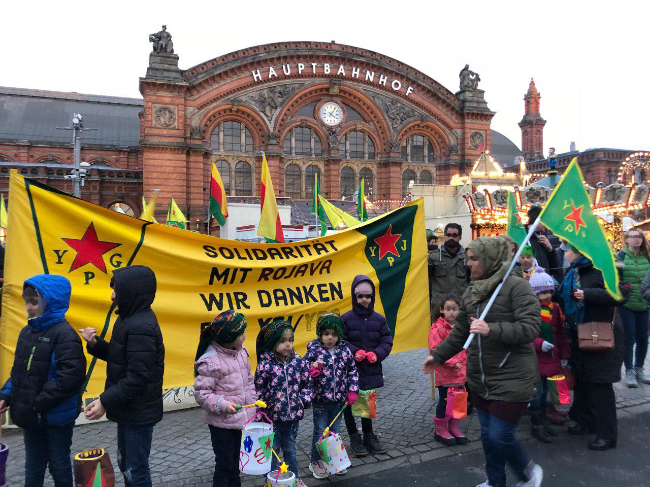 Die Auftaktkundgebung startete um 15:30 Uhr am Hauptbahnhof. Die ausgelegten Transparente sowie der Redebeitrag stießen auf viele neugierige Passant*innen. Viele nahmen Flyer entgegen, die über den Angriff der Türkei auf die Demokratische Konföderation Nordsyrien informierten. Um 16:15 setzte sich der von Kindern angeführte Laternenumzug, über die Straße Herdentor zum Domshof, in Bewegung.