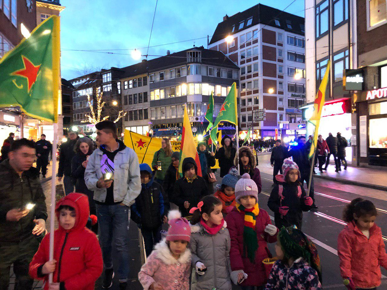 “Wir wollen hier ein Zeichen gegen den türkischen Faschismus setzen und wünschen uns, dass die Kinder in Rojava eines Tages genauso friedlich mit Laternen durch die Städte Nordsyriens laufen können”, sagte ein Redner bei der Zwischenkundgebung am Herdentor. Weiterhin betonte er: “Wir werden solange auf die Straße gehen, bis der Krieg beendet ist. Dafür tun wir alles in unserer Macht stehende, denn unsere Solidarität kennt keine Grenzen. Es lebe die Geschwisterlichkeit der Völker!”