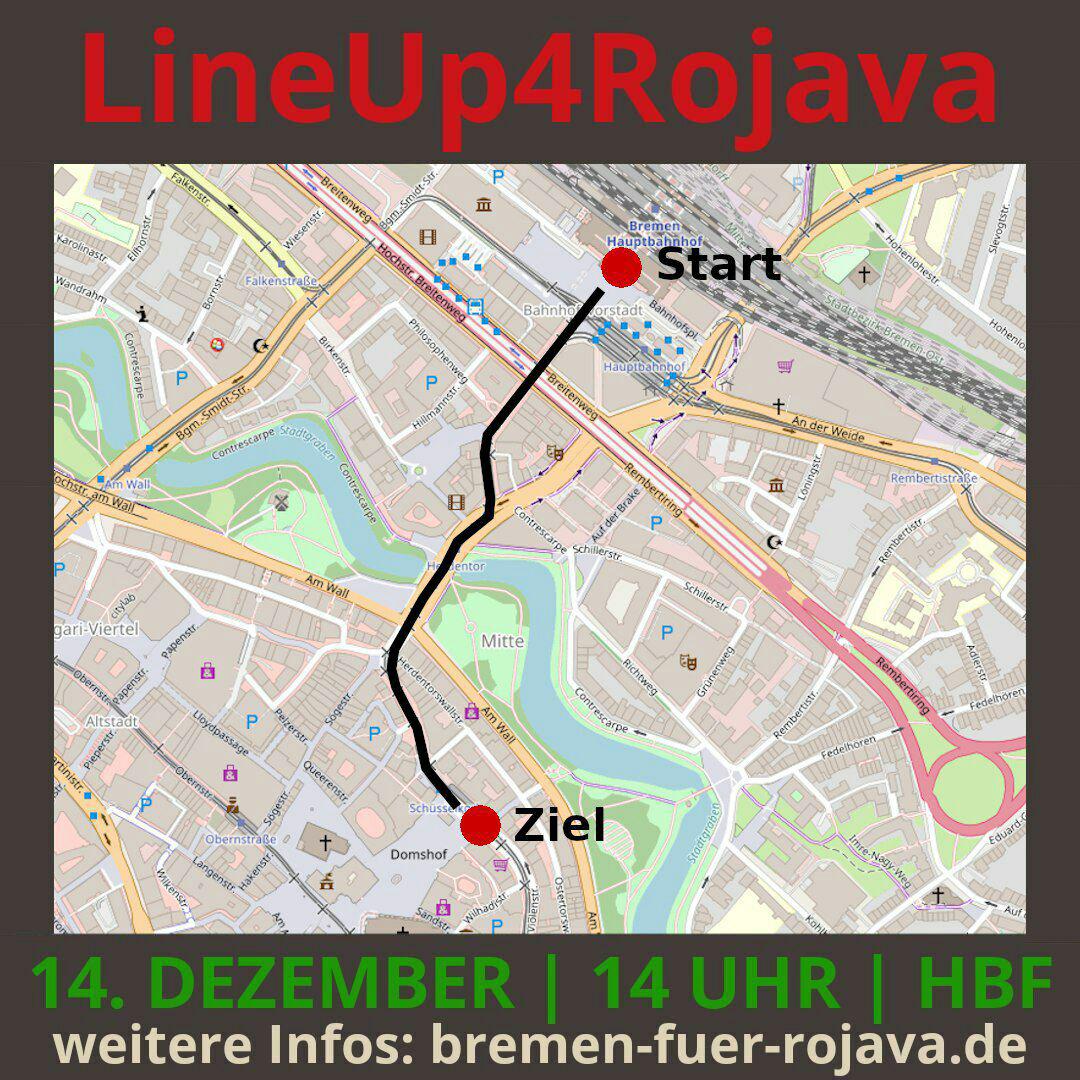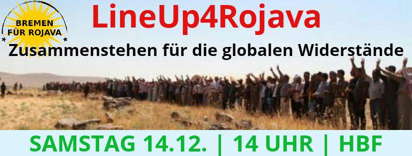 Unter dem Motto “LineUp4Rojava – Zusammenstehen für den Widerstand!” bilden wir ein langes Bild der Solidarität. Vom Hauptbahnhof bis zum Schüsselkorb geben wir den Menschen weltweit eine Stimme und machen ihre Kämpfe sichtbar. Dazu brauchen wir jede*n von euch!