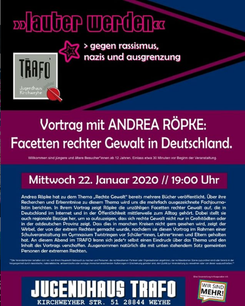 Andrea Röpke hat zu dem Thema „Rechte Gewalt“ bereits mehrere Bücher veröffentlicht. Über ihre Recherchen und Erkenntnisse zu diesem Thema wird uns die mehrfach ausgezeichnete Fachjournalistin berichten. In Ihrem Vortrag zeigt Röpke die unzähligen Facetten rechter Gewalt auf, die in Deutschland im Internet und in der Öffentlichkeit mittlerweile zum Alltag gehört. Dabei stellt sie auch regionale Bezüge her, um so aufzuzeigen, dass sich rechte Gewalt nicht nur in Großstädten oder in der ostdeutschen Provinz zeigt. Dass dies in manchen Kreisen nicht gern gesehen wird, zeigt der Wirbel, der von der extrem Rechten gemacht wurde, nachdem sie diesen Vortrag im Rahmen einer Schulveranstaltung im Gymnasium Twistringen vor Schüler*innen, Lehrer*innen und Eltern gehalten hat. An diesem Abend im TRAFO kann sich jede*r selbst einen Eindruck über das Thema und den Inhalt des Vortrags verschaffen. Ausgenommen natürlich die mit unten stehendem Satz gemeinten Personen der extremen Rechten.