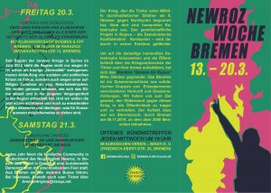 Newrozfeiern gibt es am Sonntag, 15.3. in Bremen, am 19.3. in Oldenburg und am 21.3. in Frankfurt am Main.